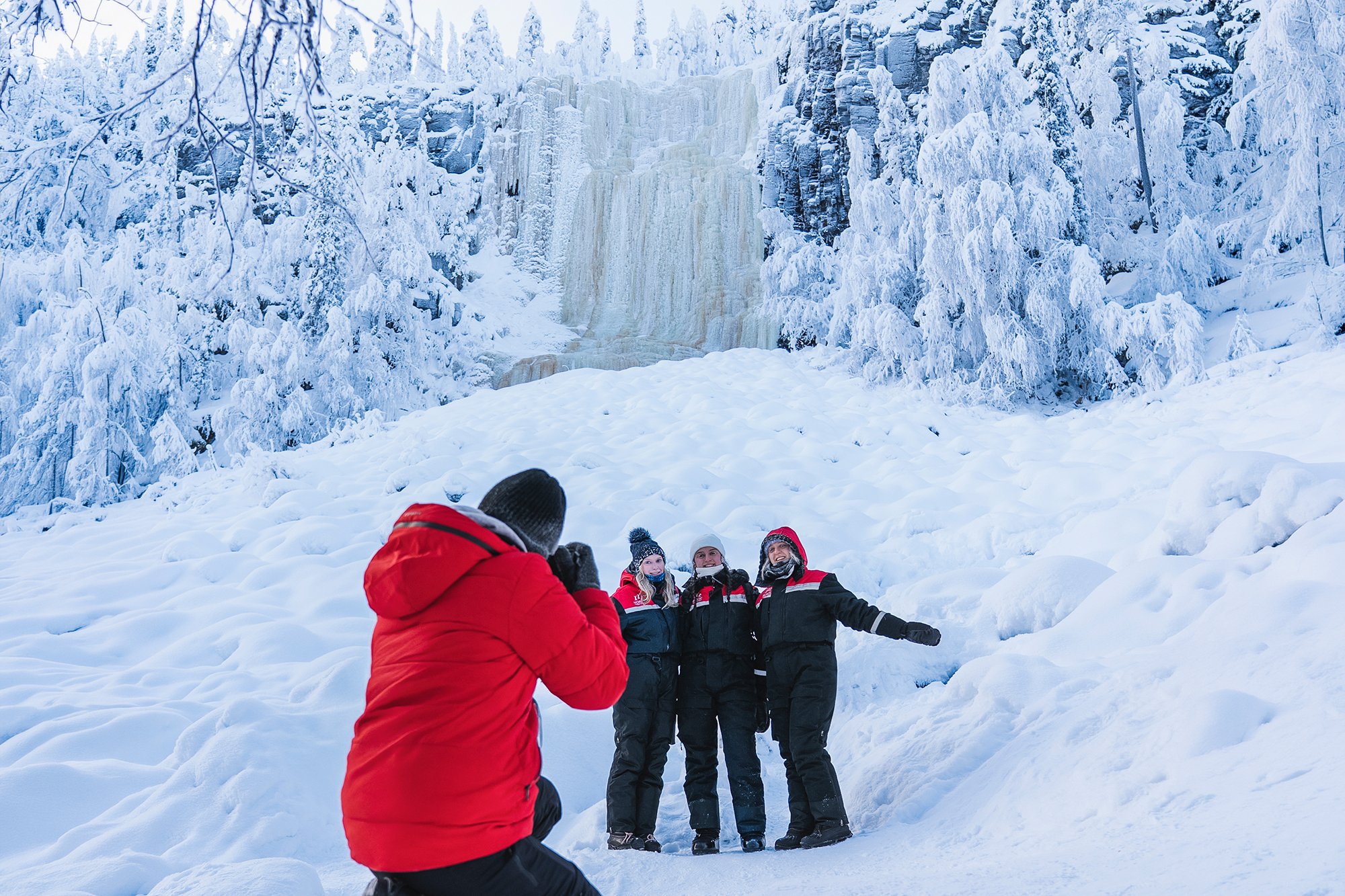 The frozen waterfalls of Korouoma are one of Finland’s most spectacular winter hiking destinations and are particularly recommended for couples or groups of friends. Located around 110 km from Rovaniemi, the waterfalls can be reached by car in about an hour and a half. It is therefore advisable to start your tour early in the morning. Our guided tour, for example, usually departs between 8:00 and 9:00 am.